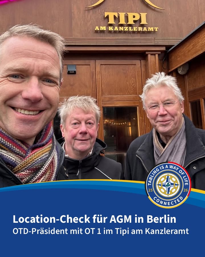 Der letzte Arbeitstermin für OTD-Präsident Dr. Matthias Hardinghaus in 2025 führt in die Nähe der Regierungszentrale in Berlin. Hier hat er sich gemeinsam mit OT 1 - Präsident Andreas Mönnig und Dieter Pumpe, Pastpräsident OT 1, das „Tipi am Kanzleramt“ angesehen. Die Location bietet den perfekten Rahmen für die festliche Gala im Rahmen des OTD AGM 2026 in Berlin.